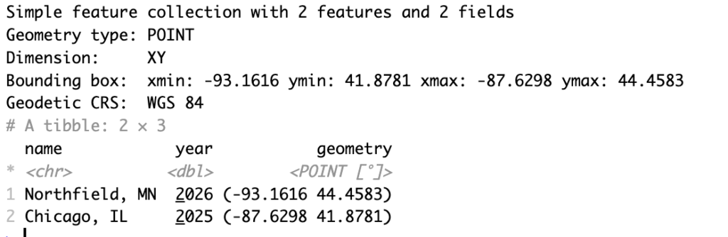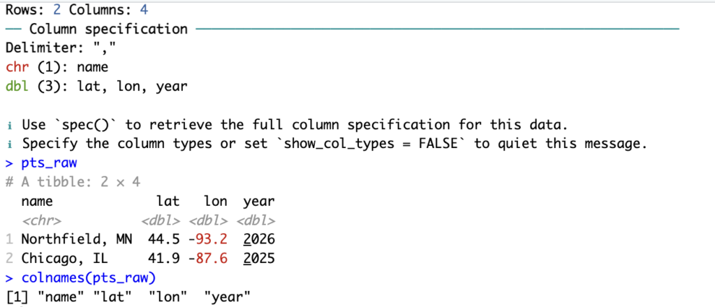 You should see your table print out and your column names listed (mine printed: "name" "lat" "lon" "year").