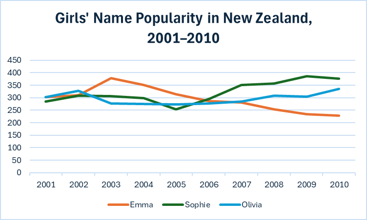 You’ll see Emma peaking in 2003 then declining, Sophie surging after 2006, and Olivia staying consistently popular throughout — three very different cultural trajectories in one glance.