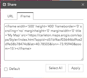 1. To embed, you want to find the Share icon in the web map you chose, and get the “iFrame” or “embed” HTML code, which should look something like this: